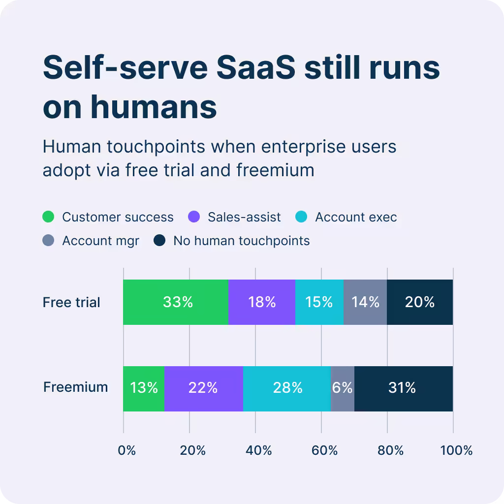 - Self-serve doesn't mean human-free: 80% of free trial products still have human touchpoints when enterprise users come through the door.